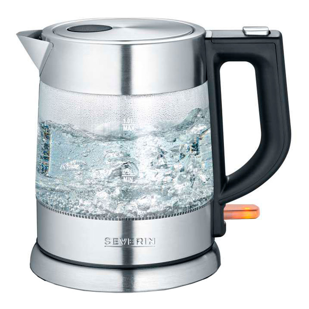 Snygg vattenkokare i glas och rostfritt stål från Severin med en kapacitet på 1 liter. Den höga effekten på 2200 W gör att vattnet kokas upp snabbt och den stänger automatisk av sig själv när vattnet kokat klart. Det ergonomiska handtaget ligger bekvämt i handen när vattnet hälls upp och bottenplattan är försedd med gummifötter vilket gör att den står stadigt på underlaget. En smidig vattenkokare som med sin stilrena design passar alla hem!
