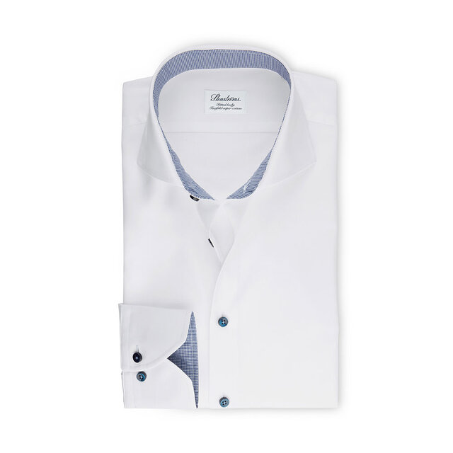 Denna fitted body skjortan är gjord av twofold bomull med en något skräddarsydd midja. Den har ett kontrastmönster i hundtandsmönster i både krage och manschetter. Skjortan är detaljerad med enkla manschetter, svarta skinande knappar och en cut away krage. Denna mångsidiga skjorta passar snyggt till ett par kostymbyxor eller till ett par jeans, för en mer avslappnad outfit.