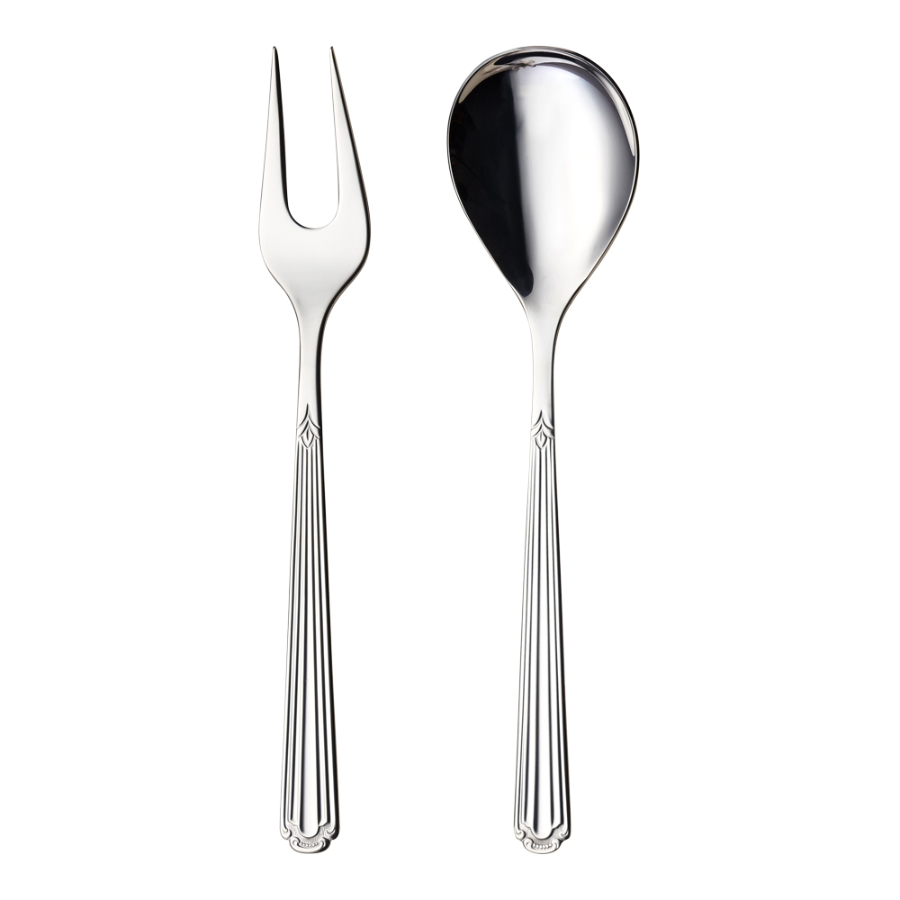 Serveringsset i 2 delar från Hardanger Bestikks serie Renessanse, formgiven av Haakon Amundsen år 1978. Designen har som namnet antyder sina anor långt tillbaka i 1400-talets Europa. Ett dekorativt bestick som tillför det lilla extra till varje dukning.