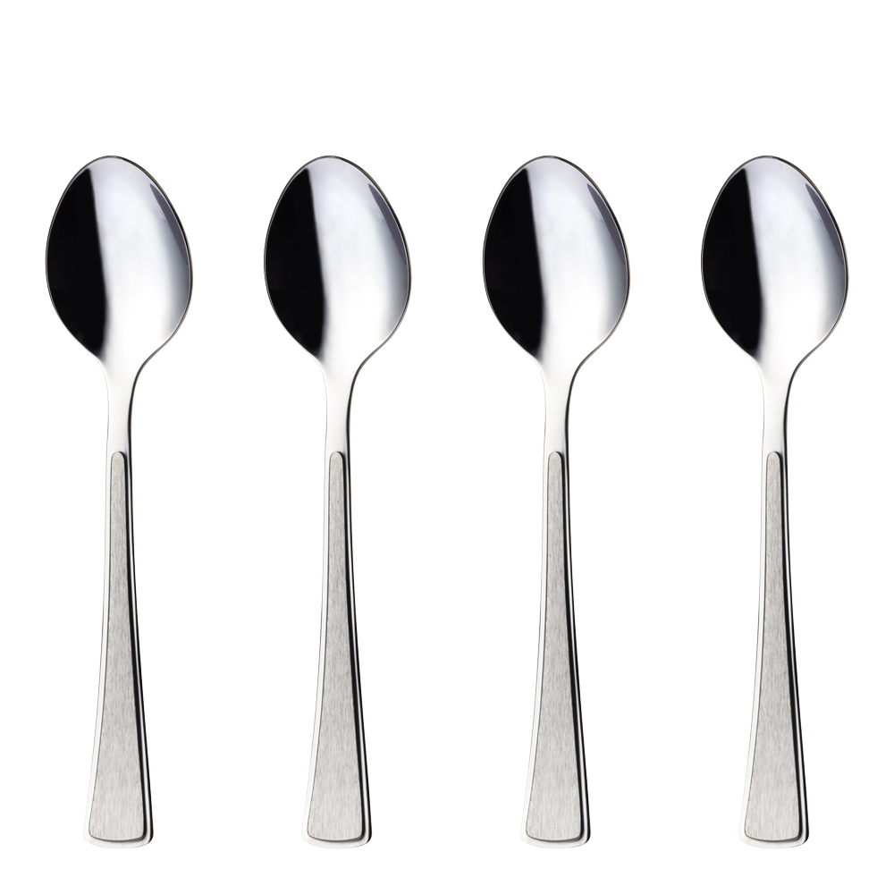 Dessertskedar för 4 personer från Hardanger Bestikks serie Ramona, formgiven av Odd Leikvoll år 1982. Sedan lanseringen har bestickserien blivit en av Hardangers absoluta bästsäljare med sina eleganta detaljer av borstat stål.