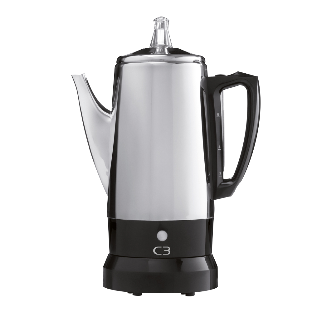 C3 Basic perkulator har en elegant Skandinavisk design och brygger starkt, varmt kaffe med en fin arom. Den har automatisk avstängning när bryggningen är klar samt en signallampa som tänds för att meddela att kaffet är färdigt. Kaffet håller dricktemperatur relativt lång tid efter färdig bryggning på grund av den höga bryggtemperaturen. Den är kompatibel till EU:s nya ECO-direktiv samt underlättar servering med sin sladdlösa utformning. C3 rekommenderar att använda pressokaffe till perkolatorn.