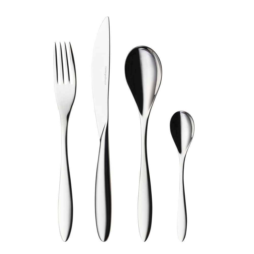 Bestickset för 6 personer från Hardanger Bestikks serie Maria. Bestickserien formgavs 2014 av Odd Leikvoll, är modern och stilren och inspirerad av vågors form då de bryts mot strandkanten. De rena formerna passar såväl vardag som fest och har snabbt blivit en favorit bland Hardangers serier. Alla bestick från Hardanger innehåller 18% krom och 10% nickel i det rostfria stålet, en ovärderlig kvalitet som har mycket lång hållbarhet.