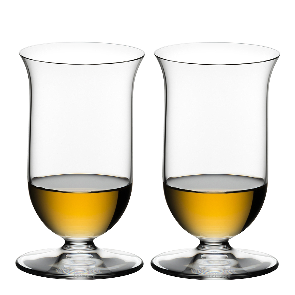 Whiskyglas i 2-pack från Riedels serie Vinum. Det här glaset är särskilt framtaget för Single Malt Whisky. Glaset har en långsmal kupa, som är lätt utsvängd i överkant. Formen förhöjer en bra whisky genom att förstärka fatens karaktär och rökighet och samtidigt tona ner alkoholens sura, stickiga doft. Något som skiljer glaset från många andra whiskyglas är att det har stam och fot. På så vis hindras drycken från att värmas upp av handen.