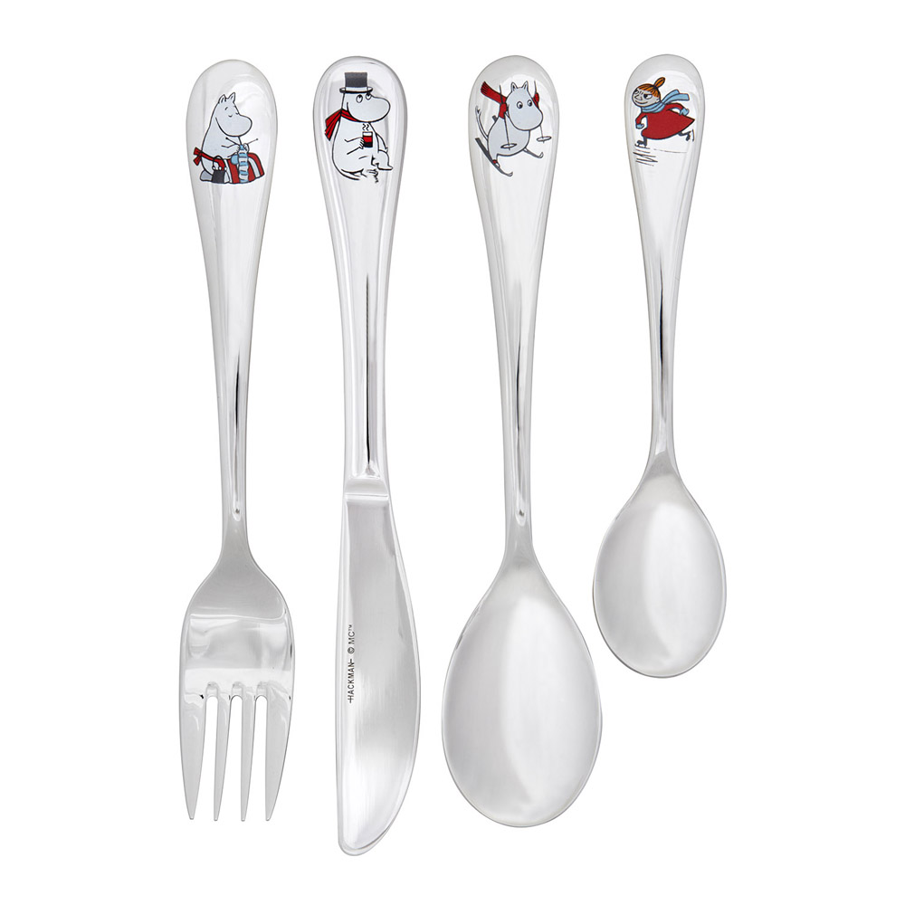 Mumindalens invånare är alltid trevligt sällskap vid matbordet, så vad kan väl passa bättre när man har fått sina första bestick och ska lära sig äta själv? Här får du sällskap av hela Muminfamiljen i ett praktiskt set på fyra delar som finns i två olika mönster att välja mellan.