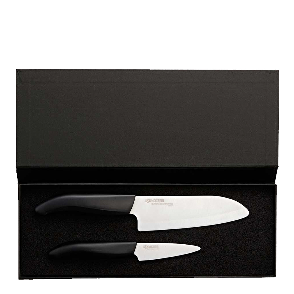 Keramiskt knivset från japanska Kyocera. Den stora kockkniven har ett blad på 14 cm och tar sig lätt igenom kött, bröd och tomater, vilka ibland kan vara svåra att skära. Den mindre skalkniven är bra för finliret, t. ex. att skära grönsaker. Svarta handtag i plast med en ergonomisk utformning som ligger bra i handen. De fina keramiska bladen lämnar ingen metallsmak eller lukt och hjälper till att bibehålla färskheten hos frukt och grönsaker. Eftersom knivarna är keramiska är de också rostfria. För att rengöra, skölj bara och torka av. Ingen särskild behandling krävs. De tål maskindisk också.