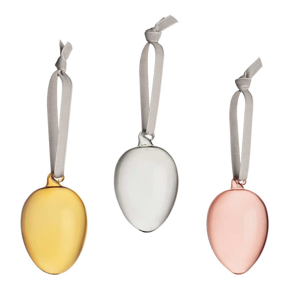 Från finska Iittala kommer dessa tre vackra glasägg vilka skapar påskstämning i alla miljöer. Genomskinligt munblåst glas; ett i gult, det andra i grått och det tredje i rosa reflekterar ljuset på ett vackert sätt. Eleganta grå tygband för upphängning medföljer. Mycket vacker dekoration i ditt påskpyntade hem, eller en omtänksam gåva.